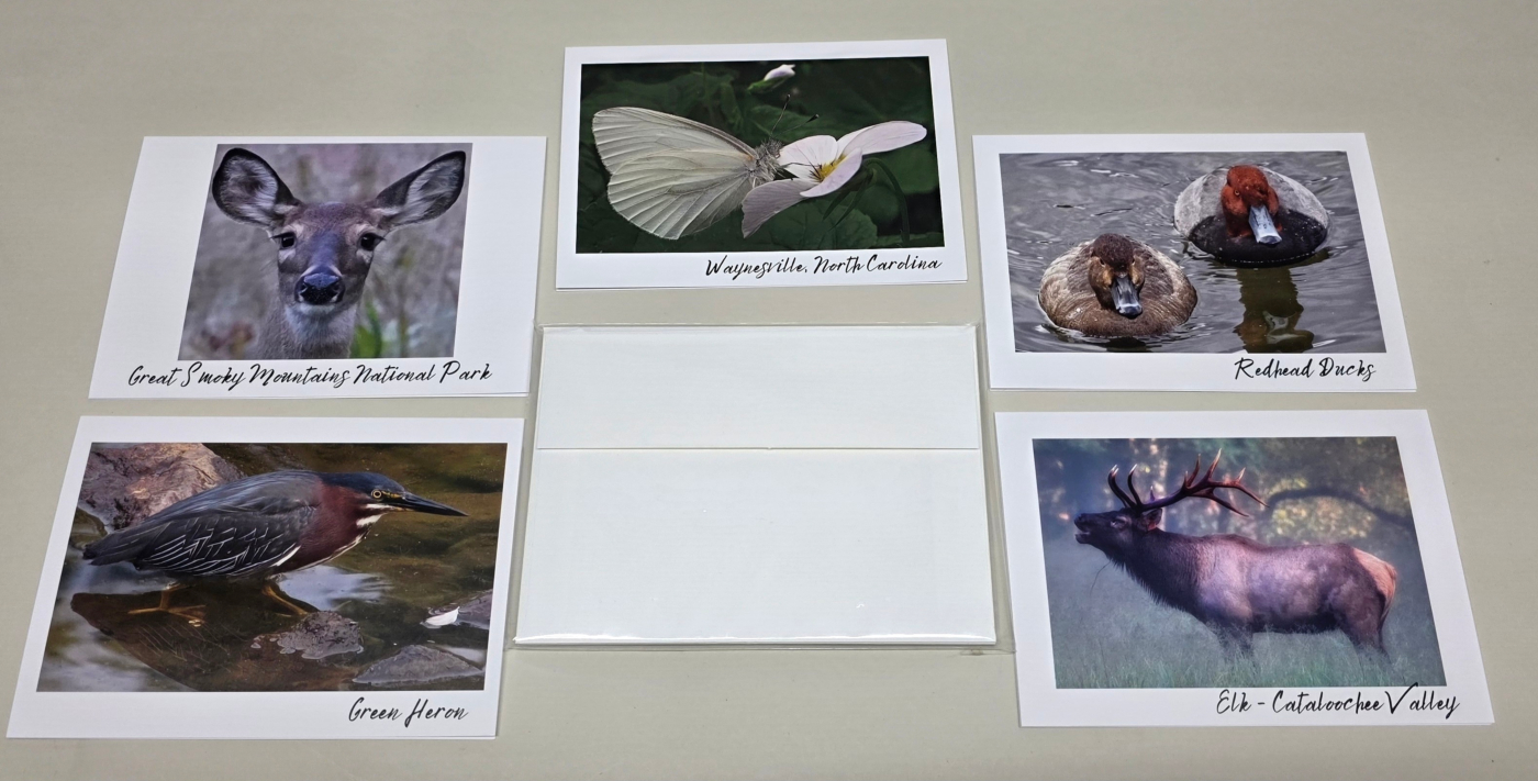 5-PACK of 5x7 NOTECARDSAll images were created in my home county in the Blue Ridge Mountains of western North Carolina. When ordering, please specify ‘Animals’ or ‘Scenics’. Lots of room to write inside!(click on pics to enlarge)$20/set